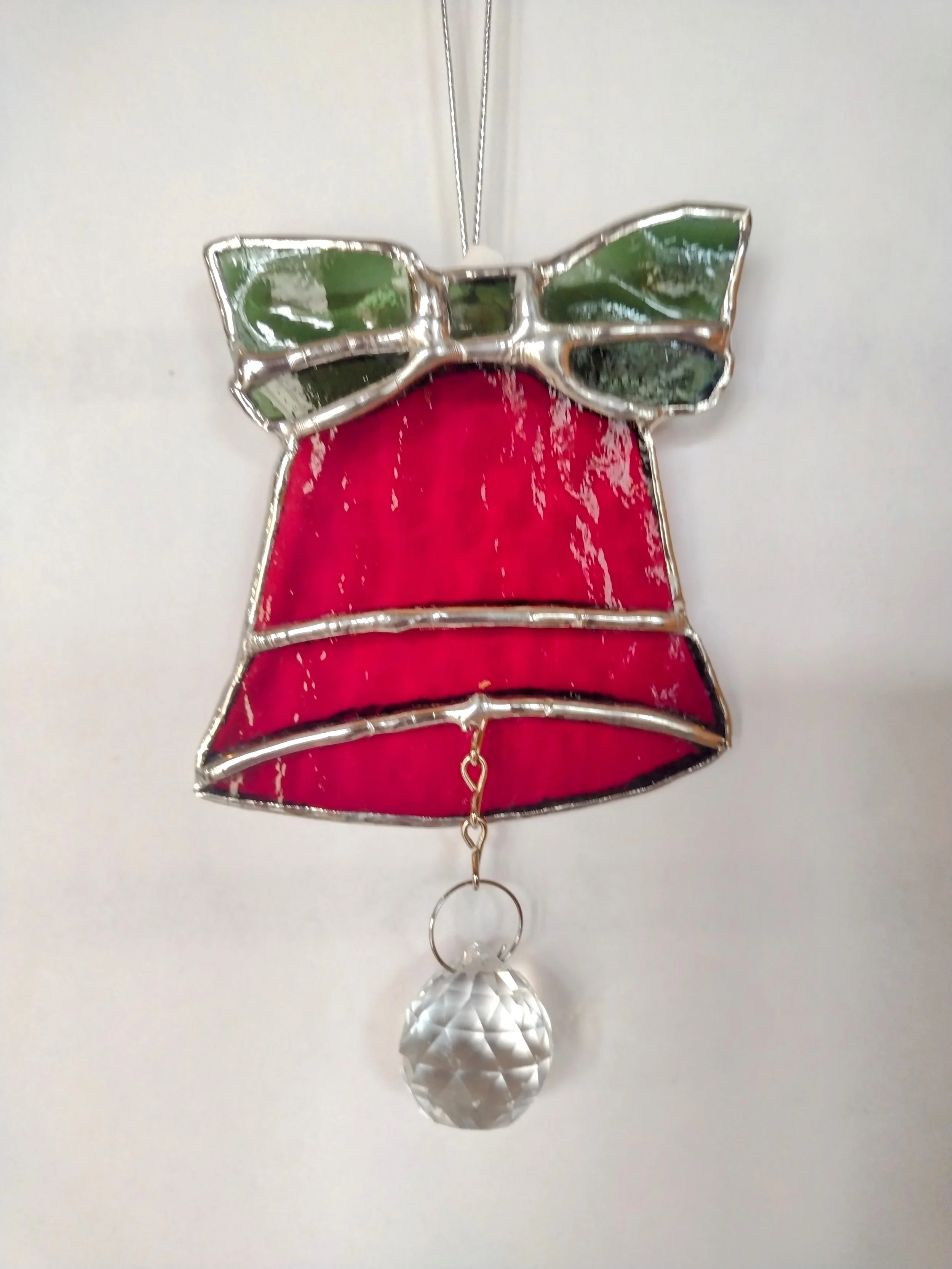 Introducing our charming red bell, elegantly adorned with a green ribbon and beautifully finished in silver solder. This delightful piece measures 4.5 inches by 3 inches, making it a perfect addition to your festive decor or a thoughtful gift for someone special.