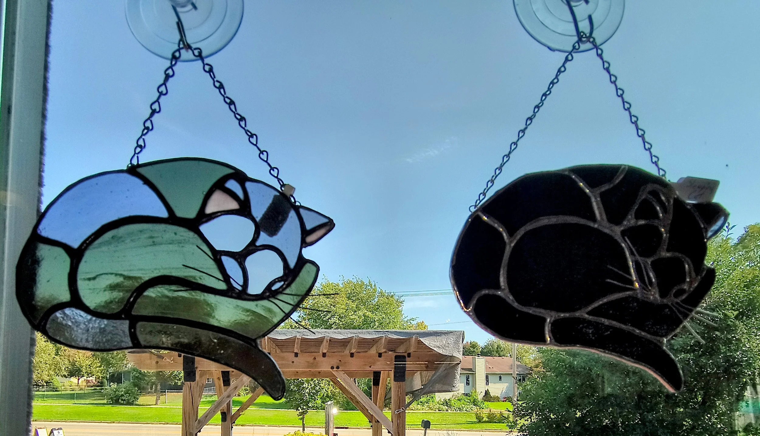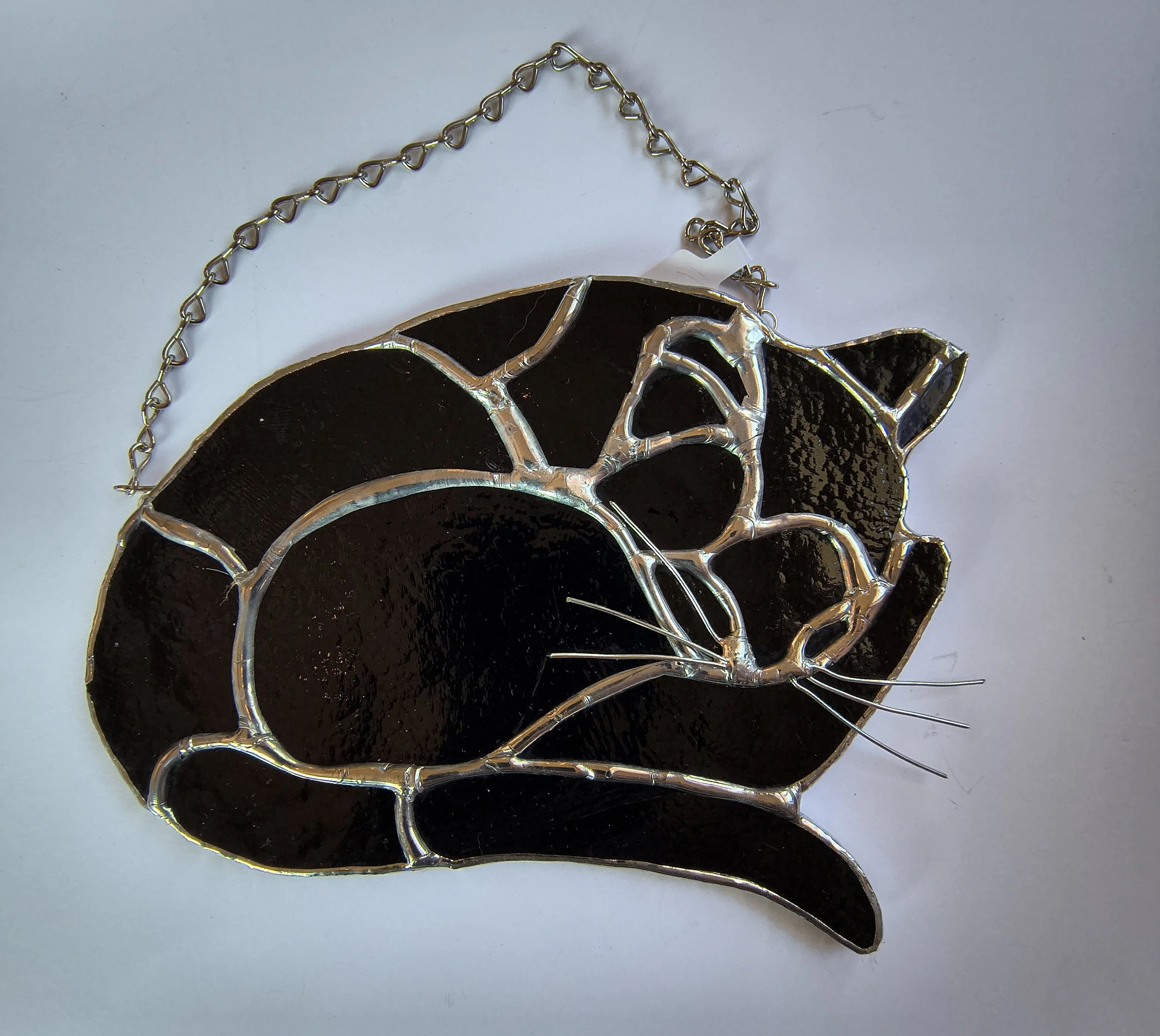 The large black cat stained glass piece measures approximately 11.5 inches by 6 inches and features striking colored eyes that add a touch of mystique. Finished with a sleek black patina and detailed with delicate wire whiskers, it captures the elegance and charm of a feline perfectly. The piece hangs gracefully with an approximate 6-inch black chain, making it a stunning and versatile addition to any space.